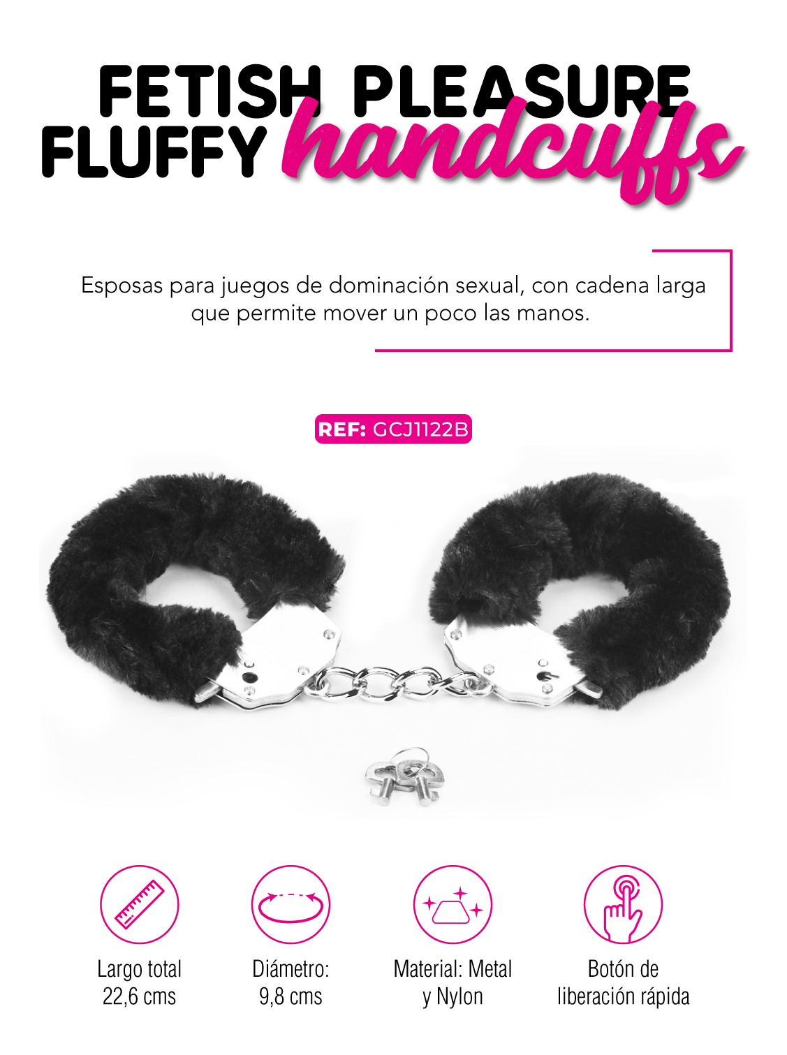 Esposas para juegos de dominación sexual, con cadena larga que permite mover un poco las manos. Esposas con botón de liberado rápido, no necesita llaves para abrir. Incluye llaves.